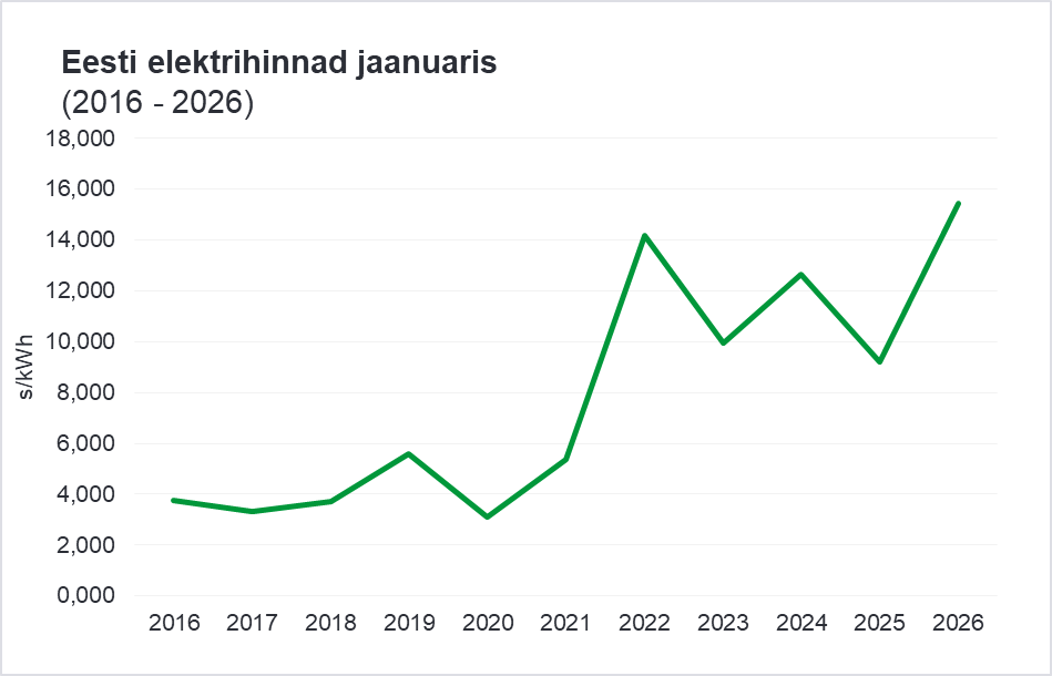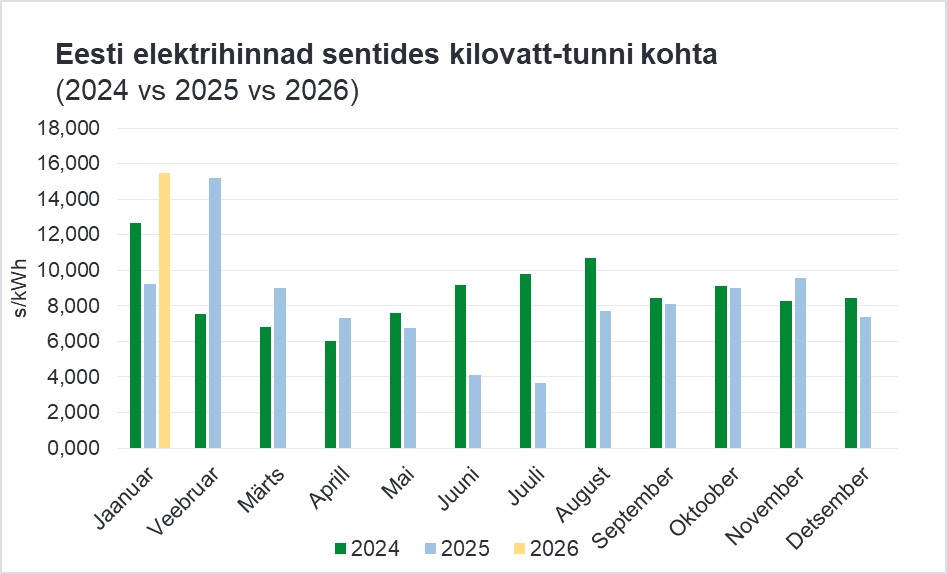 Jaanuaris kujunesid elektrihinnad Eestis külma ilma, lume, kõrge tarbimise ja laiemate regionaalsete mõjude koosmõjul. Kuu keskmine elektrihind tõusis detsembriga võrreldes 110% ning ulatus 15,4 sendini kilovatt-tunni kohta. Võrreldes eelmise aasta jaanuariga, mil Eesti keskmine elektrihind oli 9,2 senti kilovatt-tunni kohta, tähendab see 68% aastast kasvu. See on ühtlasi seni kõige kõrgema elektrihinnaga jaanuar Eestis. Seni kõige kallima elektrihinnaga jaanuarikuu oli energiakriisi alguses 2022. aastal, kui keskmine hind jõudis 14,4 sendini kilovatt-tunni kohta.