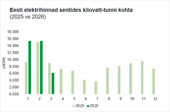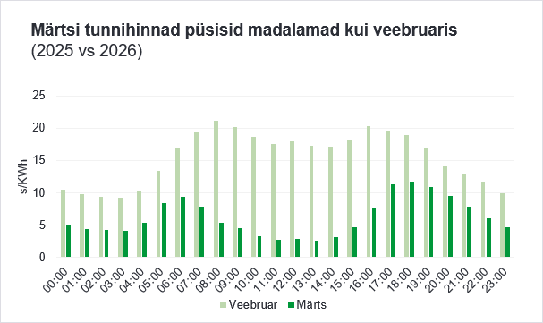 Külmaperioodi taandumisega saavad Eesti tarbijad nautida märgatavalt madalamaid elektrihindu, eriti päevastel tundidel, mil piirkonna päikeseenergia tootmine on jõuliselt kasvama hakanud. Märtsis kujunes Eesti keskmiseks elektrihinnaks 6,1 senti kilovatt-tunni eest, mis tähendab enam kui kahekordset langust võrreldes aasta esimeste kuudega, mil hinnatase püsis veidi üle 15 sendi kilovatt-tunni kohta. Võrreldes 2025. aasta märtsiga langes hind 32%. Hinnalanguse tõi soojematest õhutemperatuurist vähenenud tarbimismahud, importelekter Soomest ning taastuvenergia suurem osakaal tarbimises.