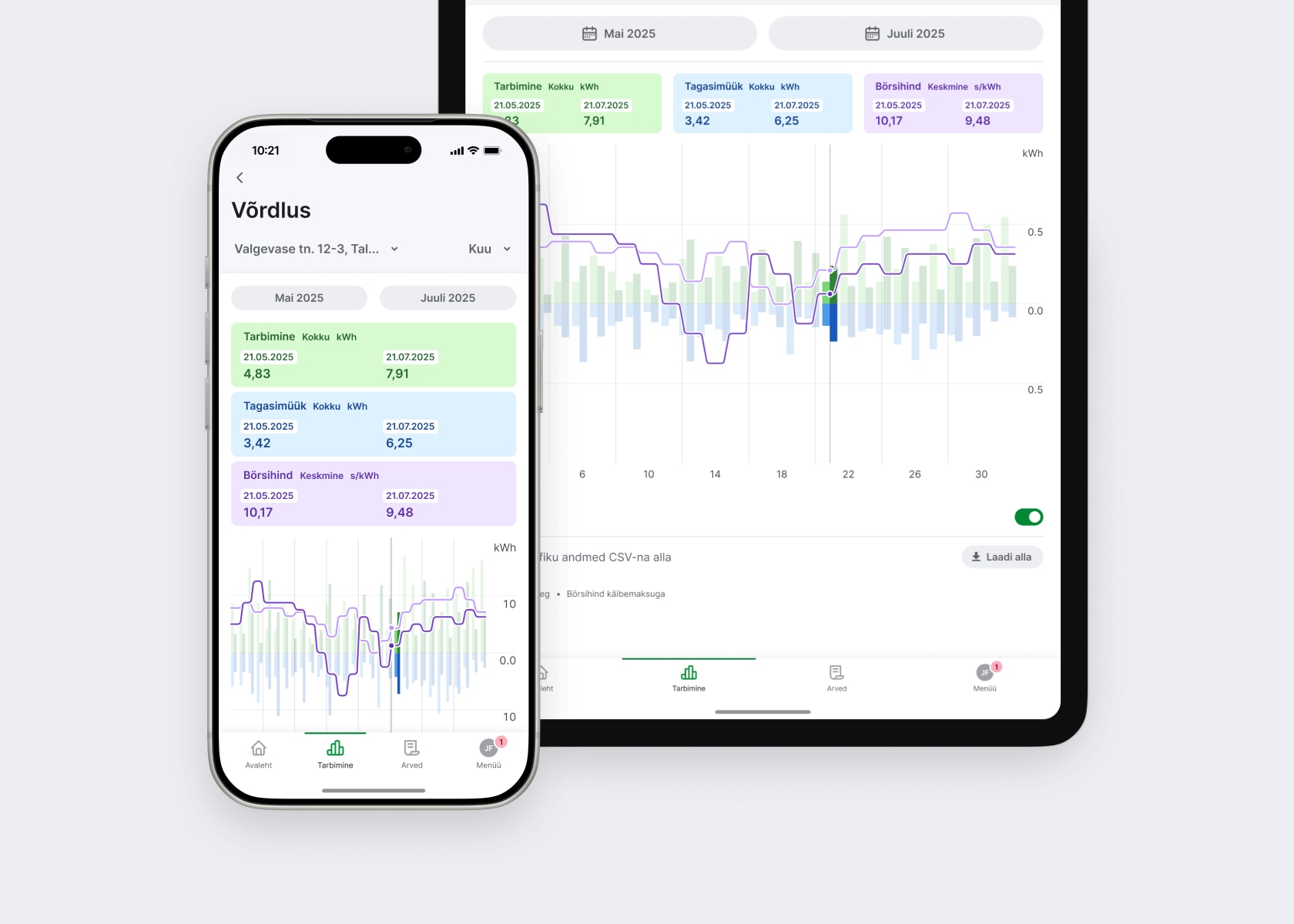 Vaata oma varasemat tarbimist ja börsihindu erinevate perioodide kaupa: 15 minutit, tund, päev, nädal või kuu. Nii saad oma energiakasutust paremini planeerida ja teha teadlikke otsuseid.
