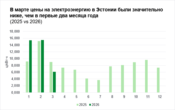 С отступлением периода холодов эстонские потребители могут воспользоваться значительно более низкими ценами на электроэнергию, особенно в дневное время, когда генерация солнечной энергии в регионе начала заметно расти. В марте средняя цена на электроэнергию в Эстонии составила 6,1 цента за киловатт-час, что означает более чем двукратное снижение по сравнению с первыми месяцами года, когда цена держалась на уровне чуть выше 15 центов за киловатт-час. По сравнению с мартом 2025 года цена снизилась на 32%. Снижение цен было обусловлено сокращением объемов потребления из-за повышения температуры воздуха и увеличения в потреблении доли возобновляемой энергии.